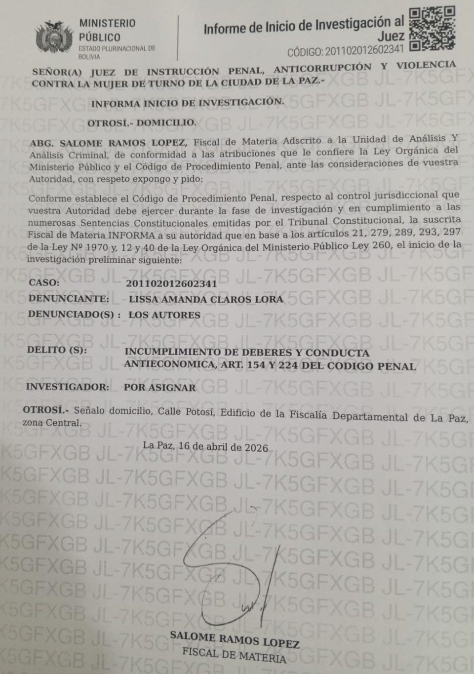 La denuncia fue registrada formalmente y dio lugar al inicio de una investigación preliminar en la ciudad de La Paz, bajo el código 201102012602341, por los presuntos delitos de incumplimiento de deberes y conducta antieconómica. El proceso se encuentra en etapa inicial y contempla la verificación de los hechos expuestos por la legisladora, además de la recolección de información técnica.