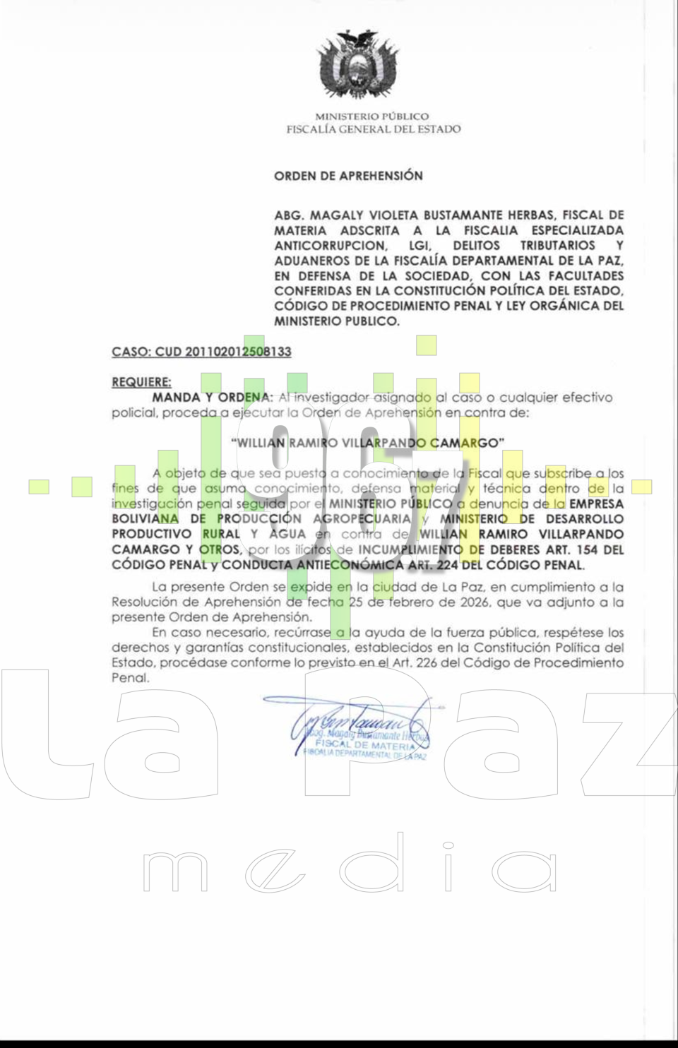 El Ministerio Público, a través de la Fiscalía Especializada en Anticorrupción de La Paz, emitió una orden de aprehensión contra William Ramiro Villarpando Camargo, exgerente de la Empresa Boliviana de Producción Agropecuaria, en el marco de la investigación de los delitos de incumplimiento de deberes (art. 154 del Código Penal) y conducta antieconómica (art. 224 del Código Penal) durante la gestión 2022-2024.