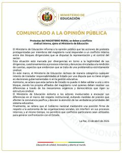 El Ministerio de Educación, por su parte, emitió un comunicado en el que atribuye las movilizaciones a un conflicto interno del magisterio rural, señalando que se trata de disputas entre bloques dirigenciales por la representación del sector. La cartera de Estado rechazó que se trasladen responsabilidades al Gobierno y exhortó a resolver las diferencias mediante mecanismos orgánicos propios de la organización sindical.