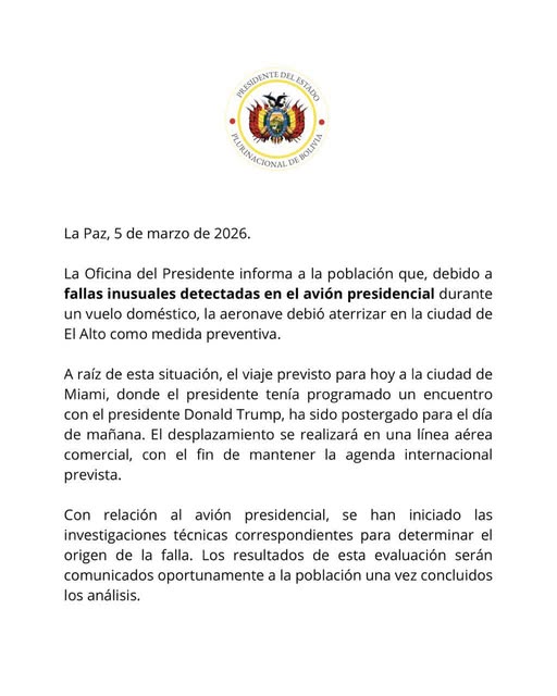 Como consecuencia, el viaje previsto para hoy a Miami, donde el presidente tenía programado un encuentro con el presidente Donald Trump, fue postergado para mañana. “El desplazamiento se realizará en una línea aérea comercial, con el fin de mantener la agenda internacional prevista”, indicó el comunicado oficial.