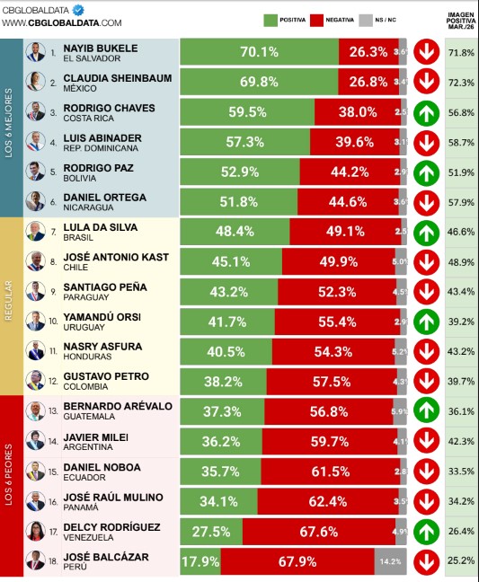 En el otro extremo del ranking, los niveles más bajos de aprobación corresponden a José María Balcázar, Delcy Rodríguez y José Raúl Mulino. El informe también identifica variaciones mensuales en la percepción ciudadana, reflejando cambios en la valoración pública de los gobiernos de la región.
