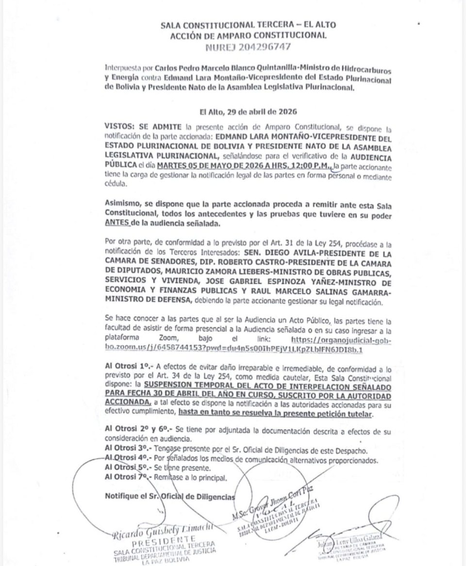 La Sala Constitucional Tercera de El Alto admitió una acción de amparo constitucional presentada por el ministro de Hidrocarburos y Energía, Carlos Pedro Marcelo Blanco Quintanilla, contra el vicepresidente del Estado Plurinacional de Bolivia y presidente nato de la Asamblea Legislativa Plurinacional, Edmand Lara Montaño. La resolución fue emitida el 29 de abril de 2026 dentro del NUREJ 204296747.