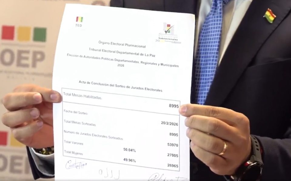 El Tribunal Supremo Electoral sorteó 53.970 jurados electorales para las elecciones subnacionales previstas para el 22 de marzo en el departamento de La Paz. El acto se realizó la mañana de este viernes para las 8.995 mesas de sufragio habilitadas, con la designación de seis jurados por mesa: tres titulares y tres suplentes.