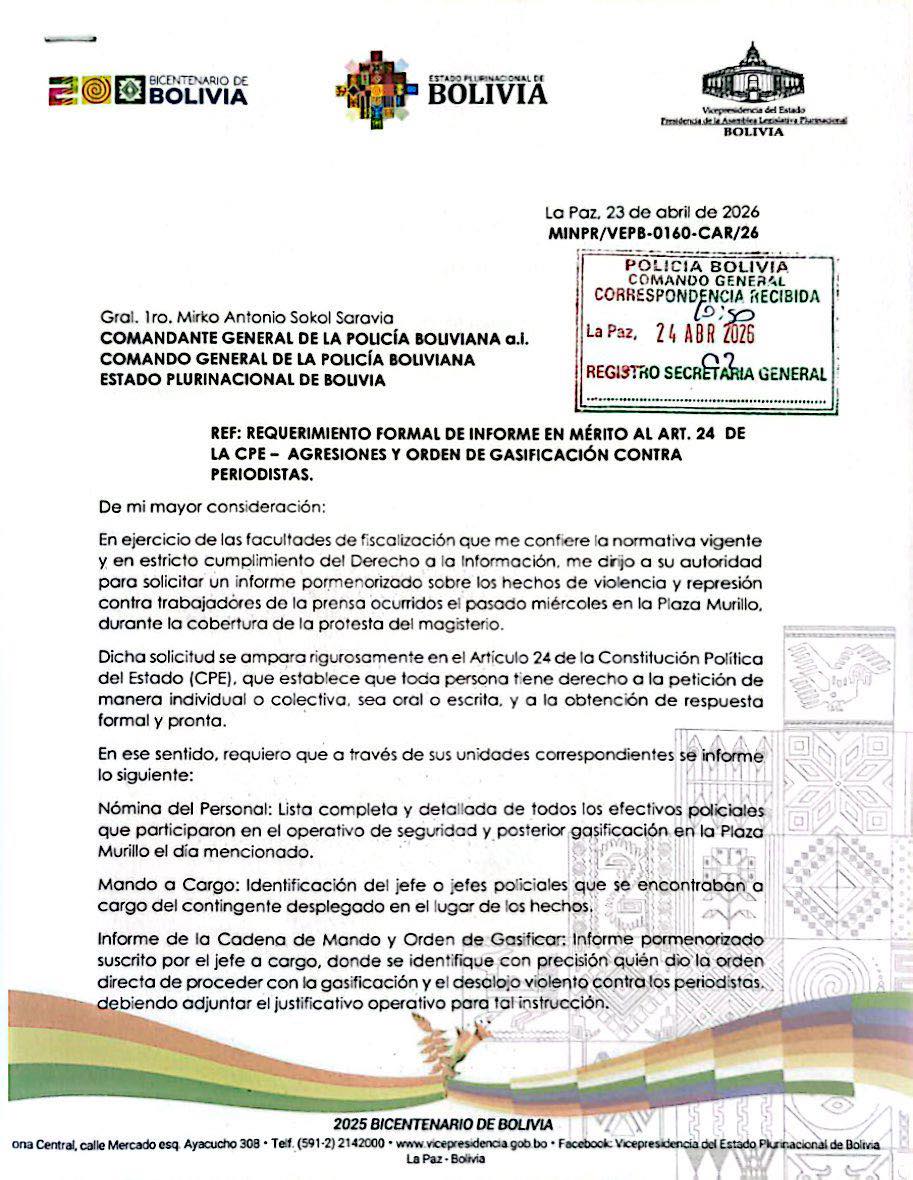 Mediante un comunicado, la autoridad informó que solicitó un informe detallado al comandante general de la Policía Boliviana, Gral. 1ro. Mirko Antonio Sokol Saravia, en el marco del artículo 24 de la Constitución Política del Estado, que garantiza el derecho de petición y acceso a la información.
