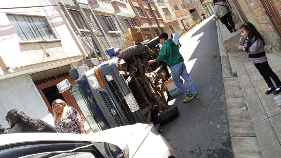 Una furgoneta protagonizó un vuelco la jornada de este lunes en la zona de Saturnino Porcel, calle 10, en el sector periférico de la ciudad, quedando recostada sobre su lado derecho en plena vía pública.